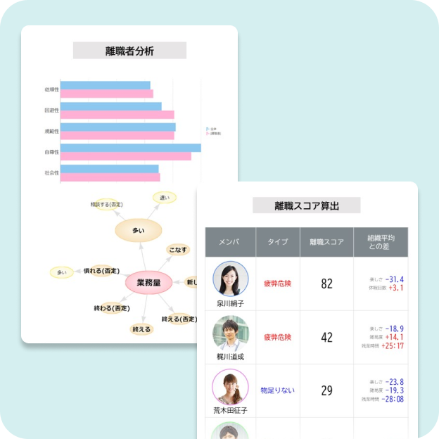 離職者の情報から離職の理由を分析することが可能。離職予兆のある社員を発見し早期フォローを支援