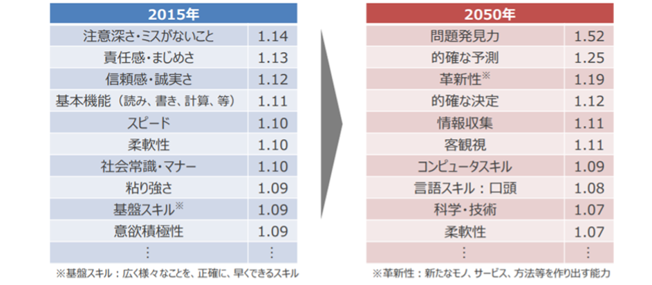 経済産業省の「未来人材ビジョン」は、生成AI普及以前の3年前の段階において、管理職層への調査結果として、求められる能力が「注意深さ・ミスがないこと」「責任感・まじめさ」「信頼感・誠実さ」から、2050年に向けては「問題発見力」「的確な予測」「革新性」へとシフトすることを明示しています。