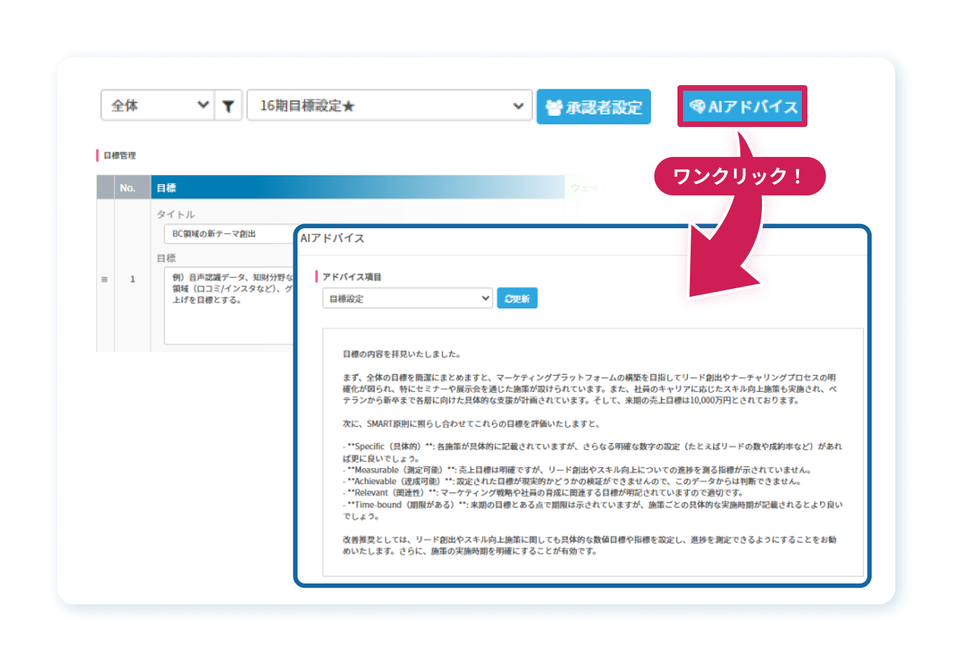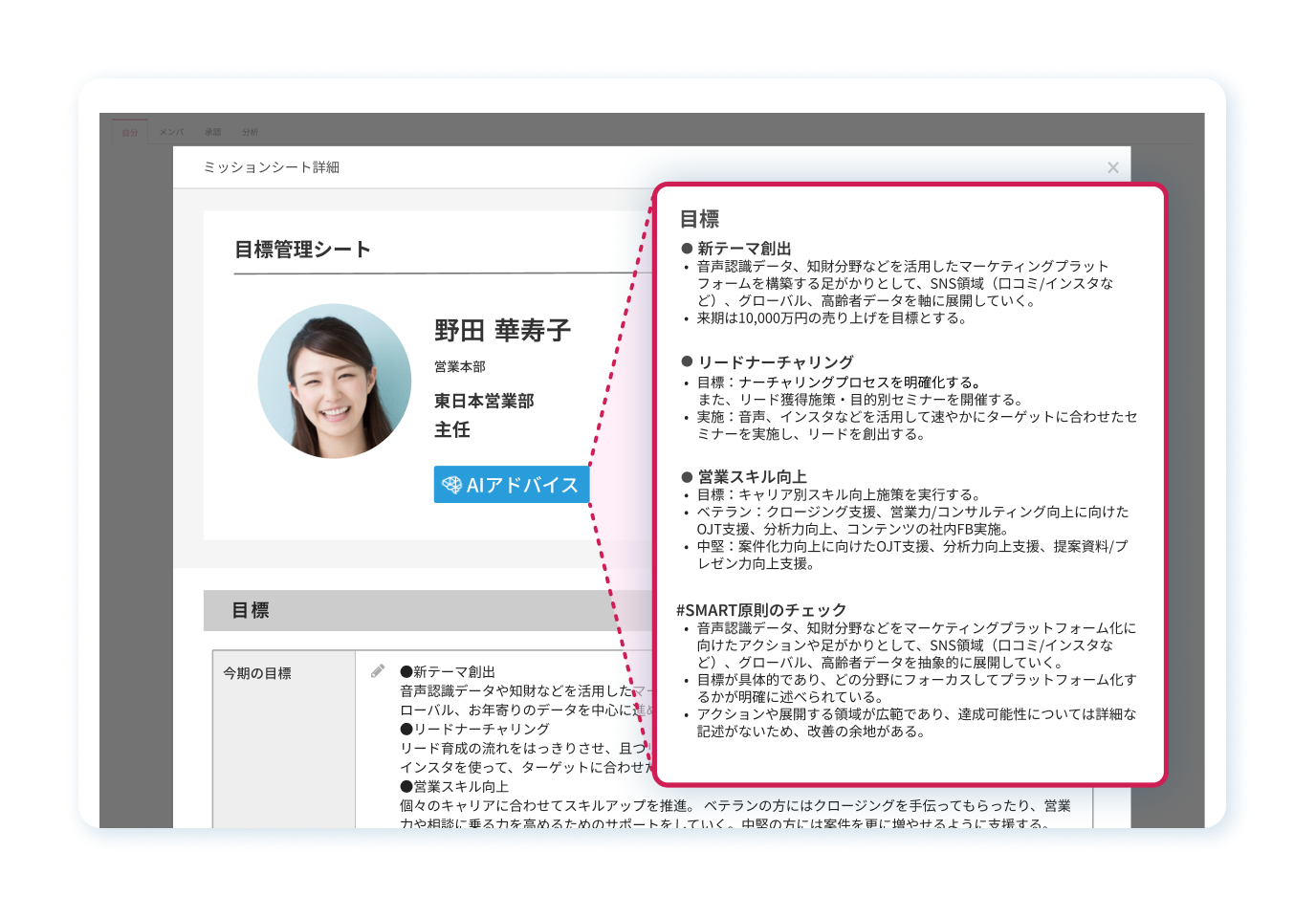 社員がAIからの具体的なアドバイスを受けることで、自身の目標設定の精度が向上し、組織目標達成に大きく貢献できるようになります