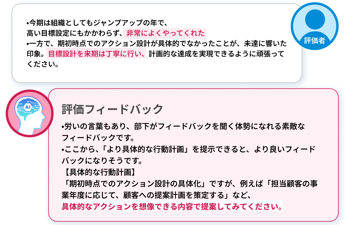個別評価ポイント整理と効果的なフィードバック方法の提案を通じ、評価者のフィードバック能力が向上。社員は質の高いフィードバックを受け、自身の成長を促進できます。