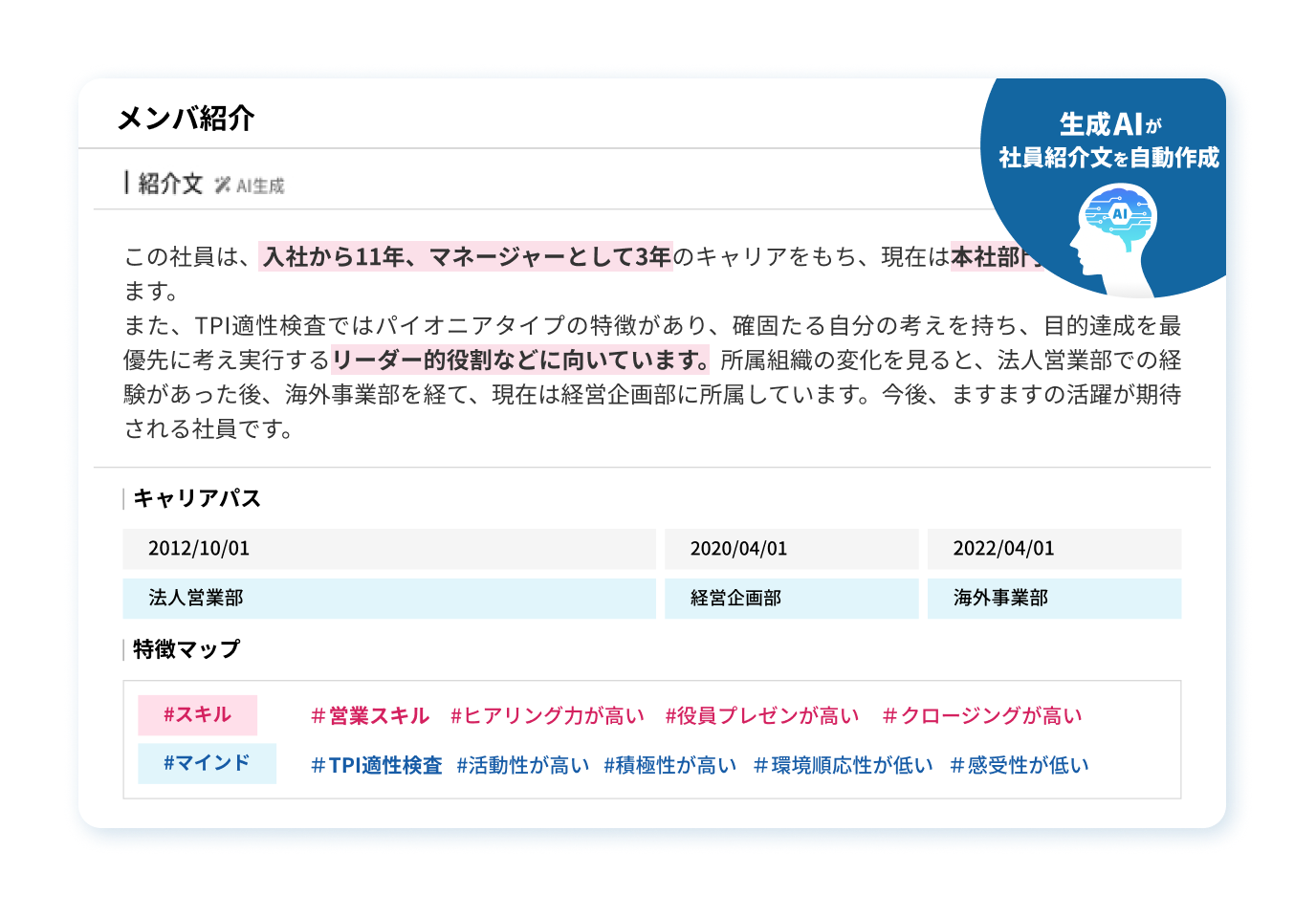 - 蓄積された人材データをもとに、生成AIが社員一人ひとりの特徴を紹介します。