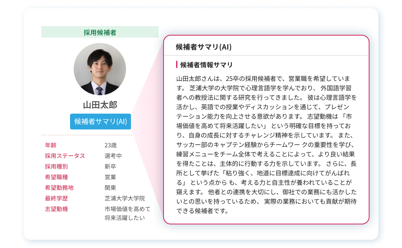 - 人材データの更新に即時対応し、常に最新の紹介文を提供します。
