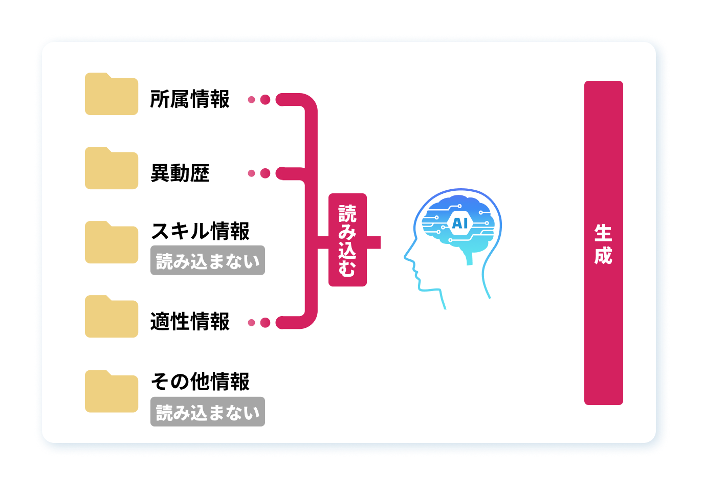 管理者は、異動歴やスキル情報など、紹介文の生成に利用するデータ項目を自由に選択し制御できます。必要な情報だけを効果的に開示する設定が可能です。