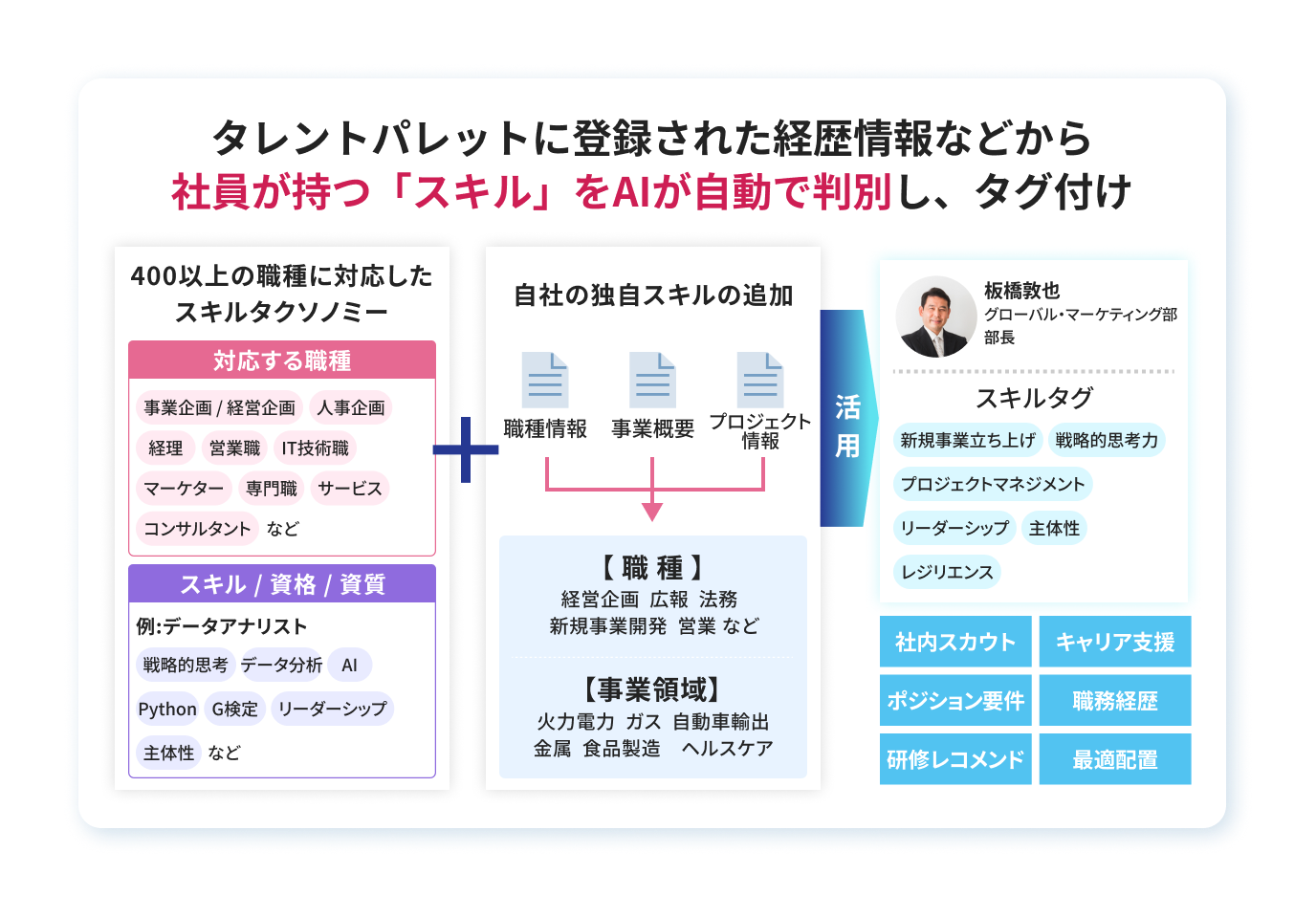 400以上の職種に対応した「スキルタクソノミー(業界標準のスキル体系)」に基づき、生成AIが経歴からスキルを自動判別してタグ付けします(自社の独自スキルの追加にも対応)。可視化されたスキルデータは、最適配置、個別の育成計画(研修レコメンド)に即座に活用できます。