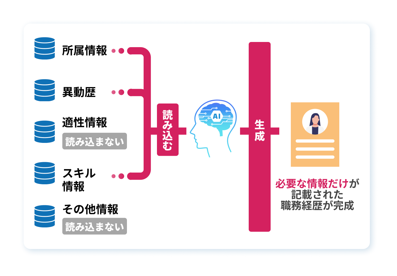 - 生成AIが社員の職務経歴を自動生成。社員の経験や強みをAIが言語化し、更新の手間も削減します。