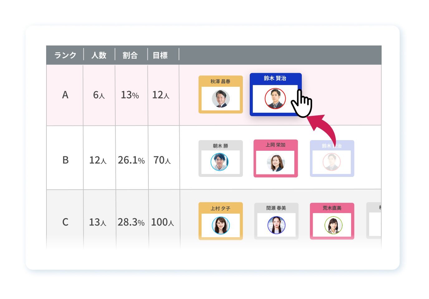 Excelでの煩雑なデータ集計準備や調整会議での感覚的な議論を排除。各部門が出してきた絶対評価を評価点数順に並べ替え、ドラッグ&ドロップで評価調整をする事を実現します。