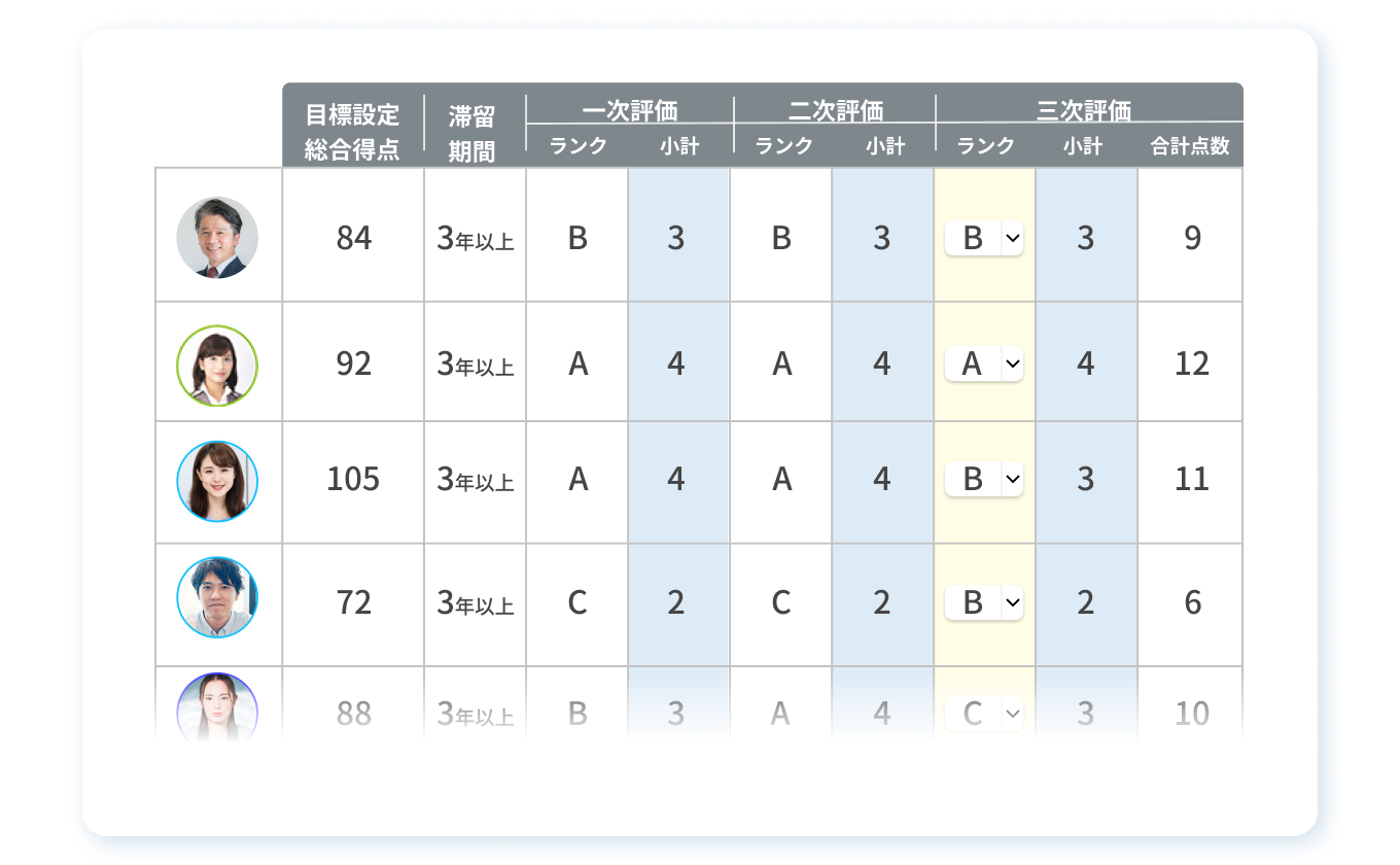 - 評価分布や傾向をリアルタイムに把握し、スムーズな評価調整を実現します。