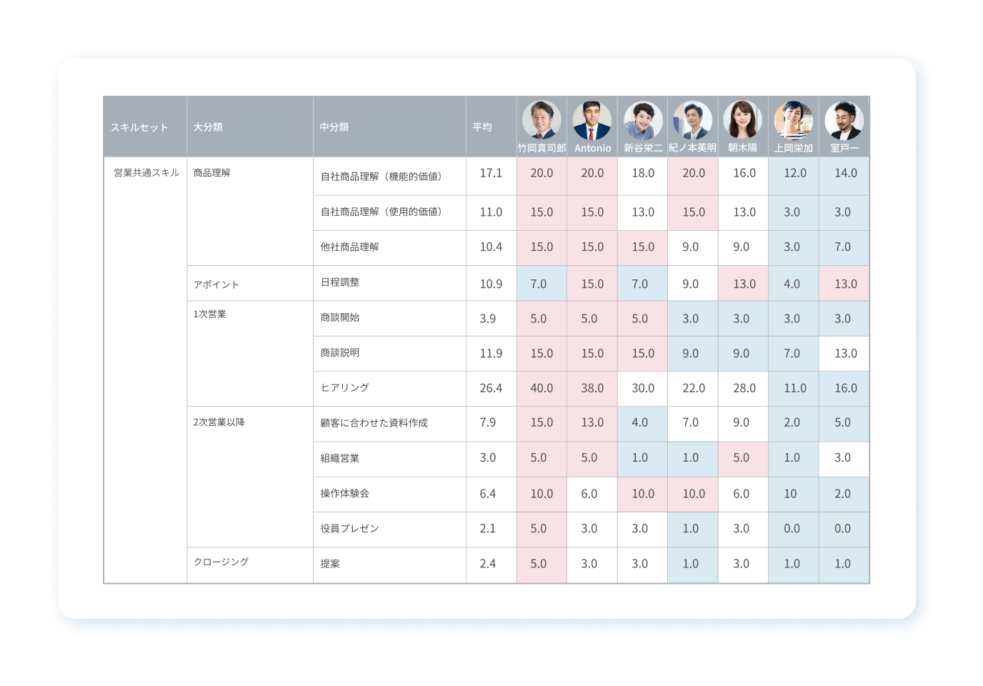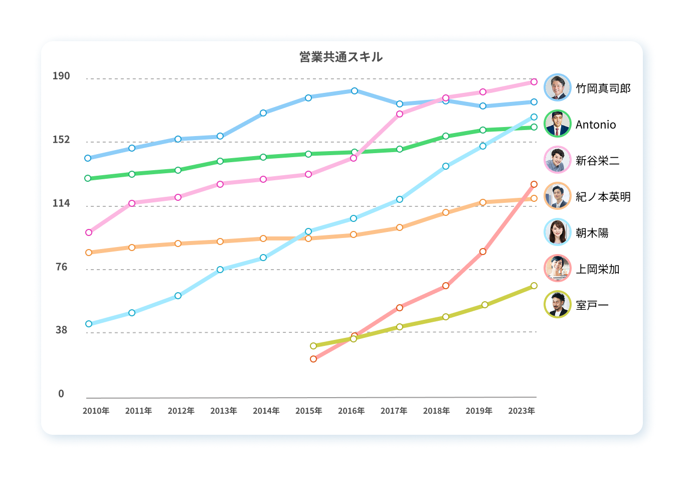 - スキルや経験値の伸長をデータで可視化し、適切な人材配置や育成機会の検討を支援します。