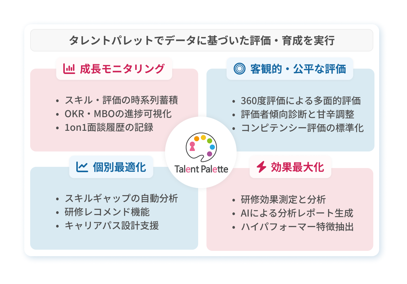- 個人の能力開発目標に対する進捗を定量的に把握し、達成へのボトルネックを特定します。