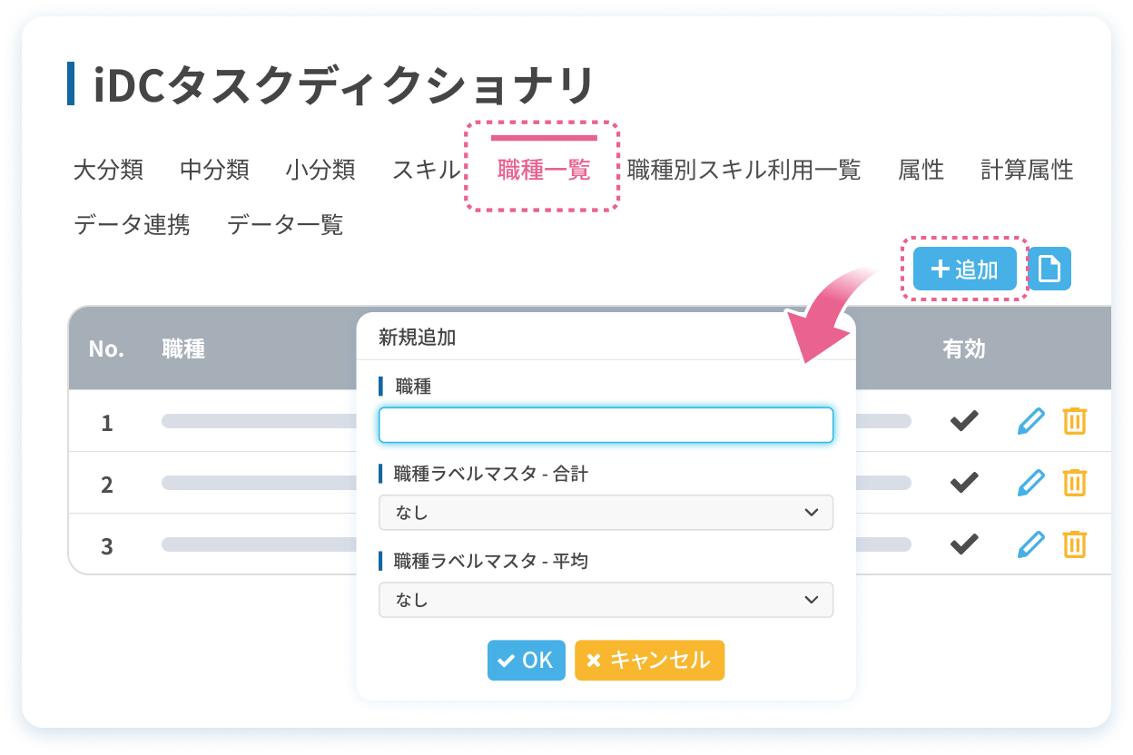 テンプレートのみでなく、自社独自の職種(ジョブ)やスキル項目を自由に追加・カスタマイズ可能です。 企業ごとの実態に合わせた柔軟なタスク・スキル管理を実現し、運用負荷を下げつつ独自性を担保します。