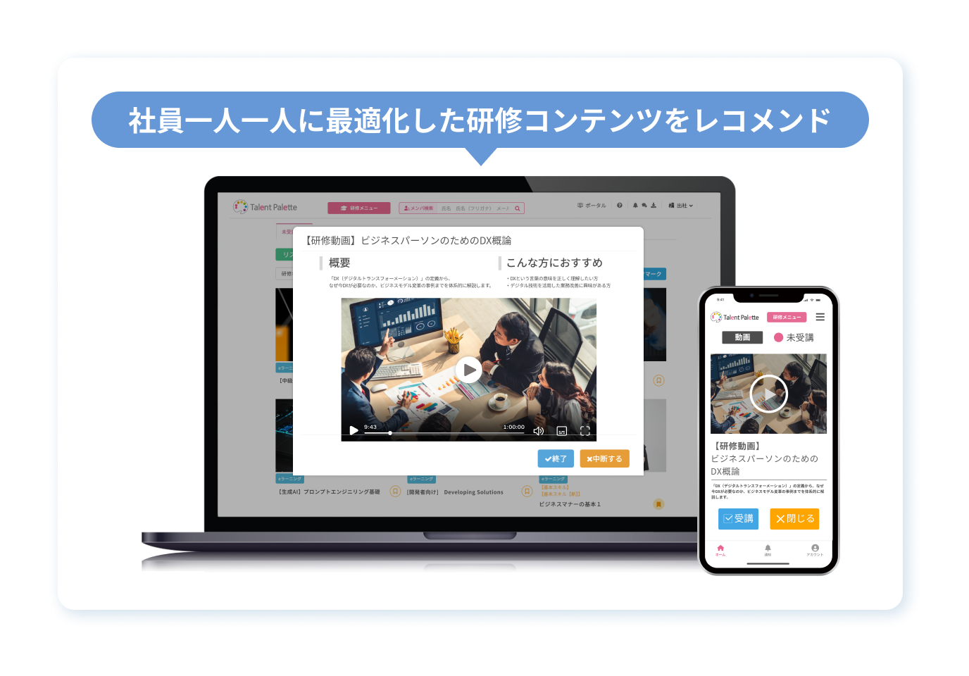 - スキルから人材要件を自動生成、研修の紐づけができ、社内の専門人材の可視化と育成を促進します。