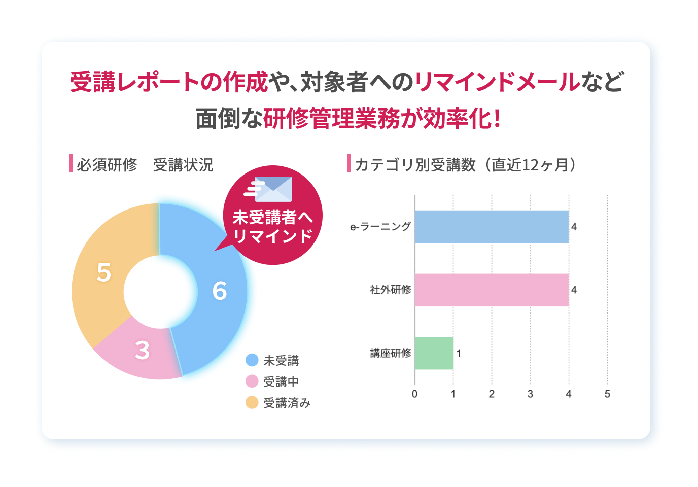 LMS(学習管理システム)として、自社コンテンツの配信、テスト実施、研修申し込み、受講状況の確認まで1つのシステムで完結し、社内外の多様な研修コースを一元管理します。従来はExcelや複数のツールで管理していた煩雑な研修業務を集約することで、担当者の管理工数を削減しながら、社員にとっても受講しやすい環境を提供します。
