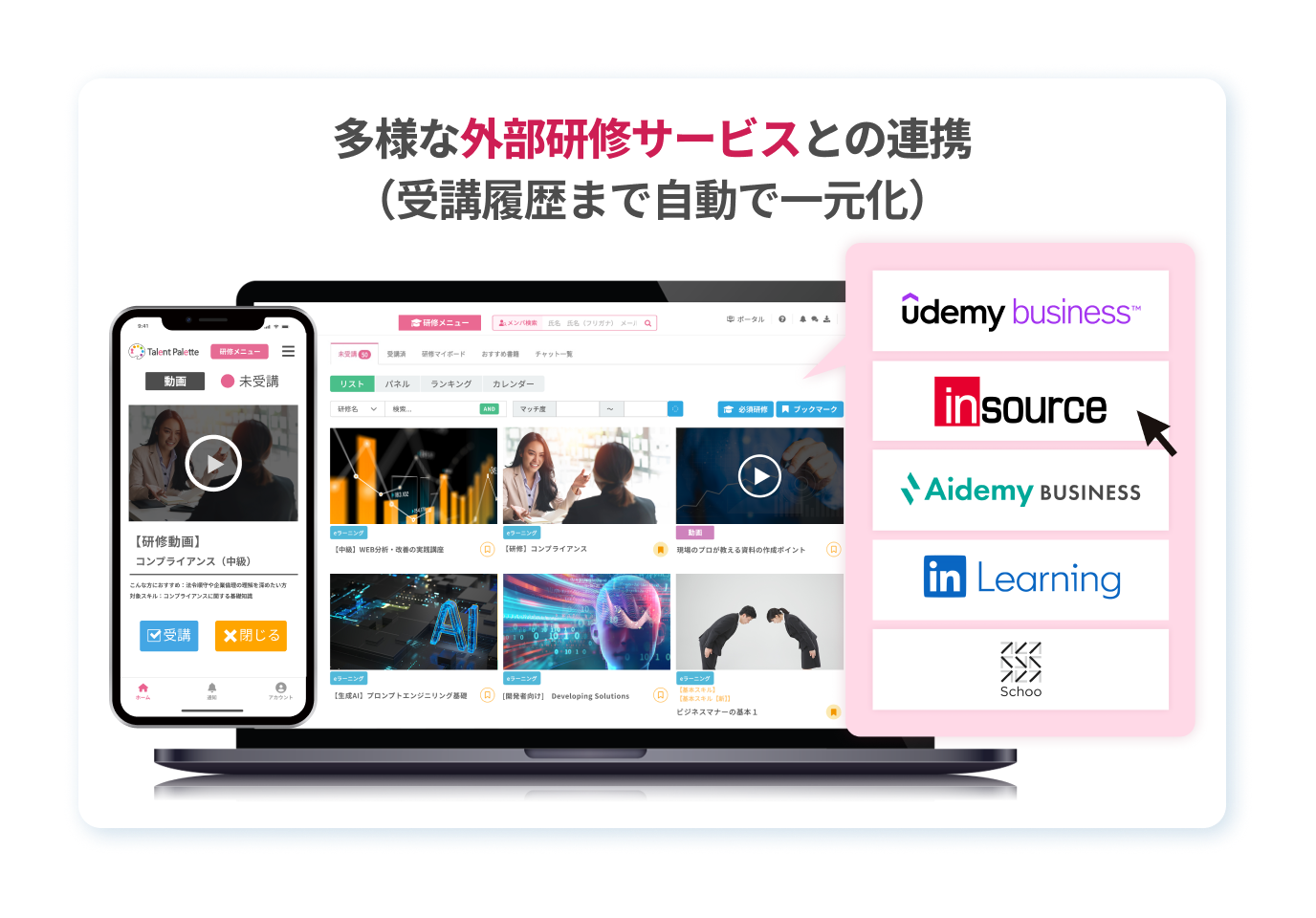 - 自社コンテンツだけでなく、外部のオンライン研修サービスとも連携し、学習の利便性を高めます。