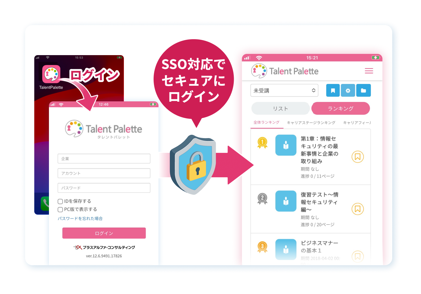 スマホアプリからのアクセスにも対応。機能の部分開放なども設定でき、セキュリティ面も安心です。 PCがない環境の従業員に対しても、等しく研修環境の提供を可能にします。