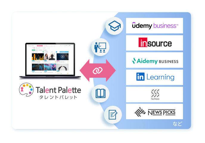 Udemy BusinessやAidemy Business、インソース社の公開講座など、質の高い外部コンテンツと標準で連携可能です。受講履歴がタレントパレットに自動で集約されるため、複数のプラットフォームを管理する手間を省き、全社員の学習状況をリアルタイムで一元管理できます。