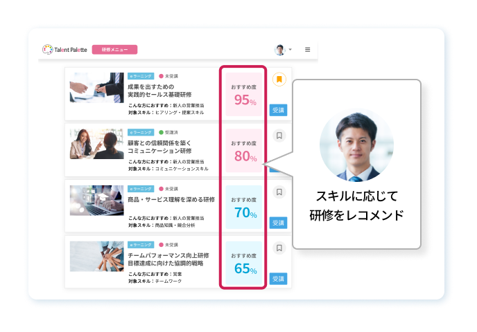 - 社員一人ひとりのスキル不足を可視化し、最適な研修を自動でレコメンドできます。