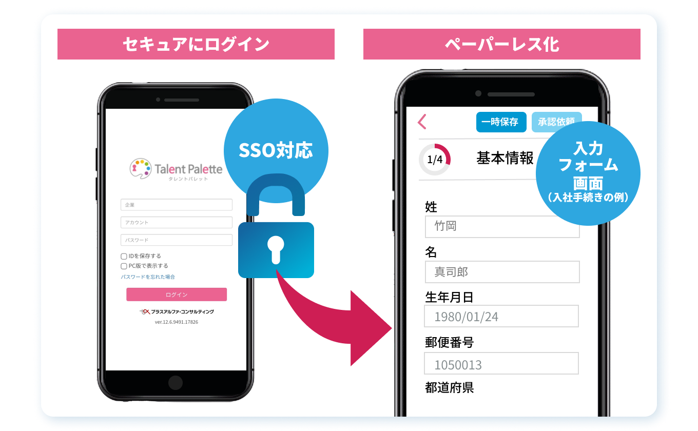 入社手続き、住所変更、扶養家族の登録など、従来は紙で行っていた書類業務をスマホで完結できます。SSOによるセキュアなログインに対応し、安全な環境で現場からのデータ入力や確認が可能なため、人事担当者の書類処理工数を削減しながら、リアルタイムなデータ活用を実現します。