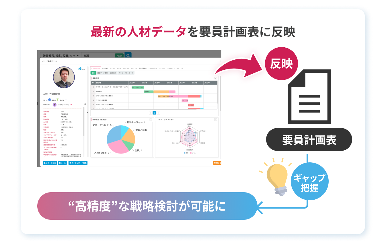 計画上の不足要員やスキルギャップに基づき、同一システム内で採用管理・人員配置の異動シミュレーション・次世代リーダーの育成計画まで一貫して実行できます。要員計画から人事施策の実行まで、ツールを切り替える必要はありません。