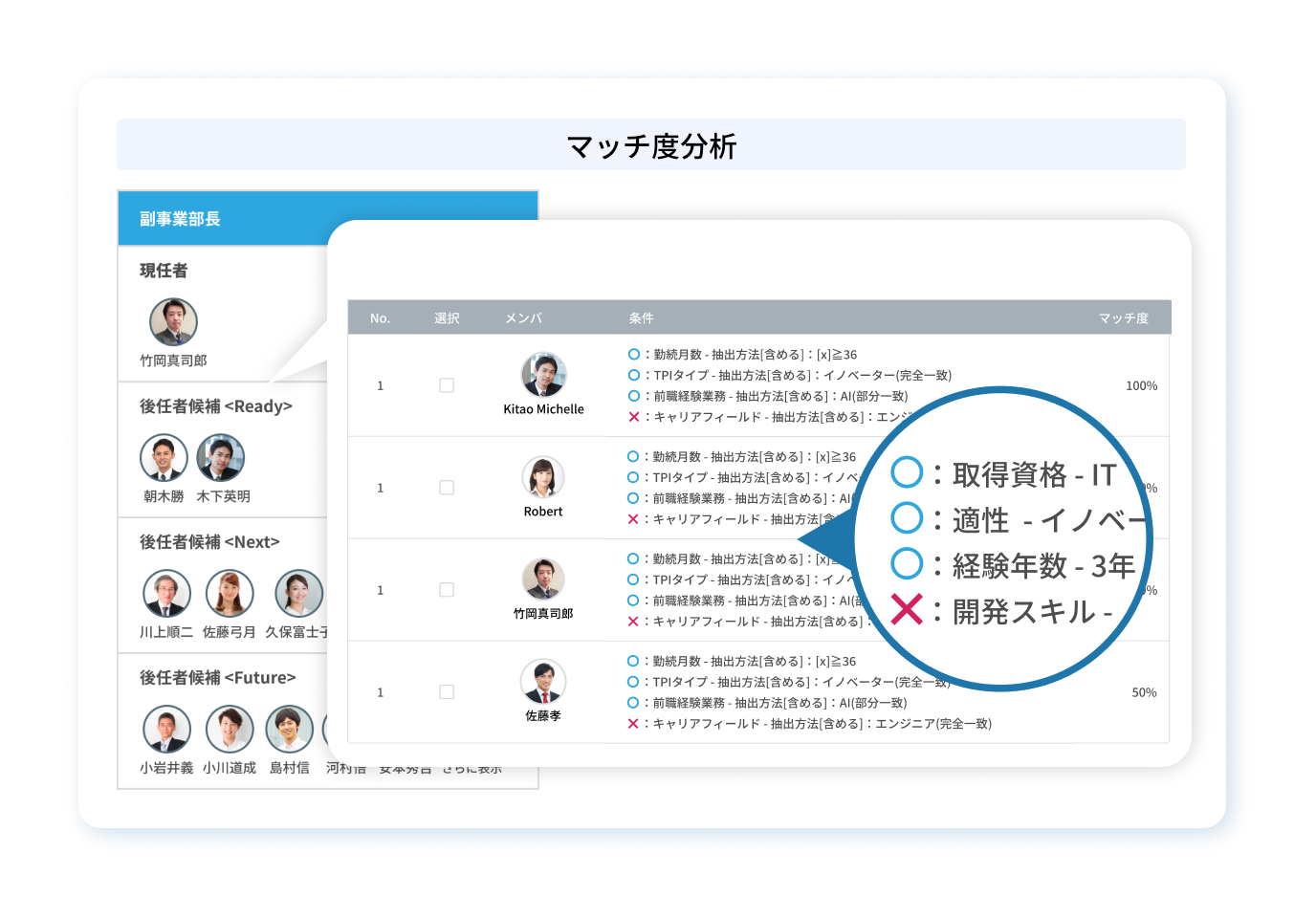 - 後継者育成・抜擢・グループ間異動により、戦略的な人材配置を実現します。