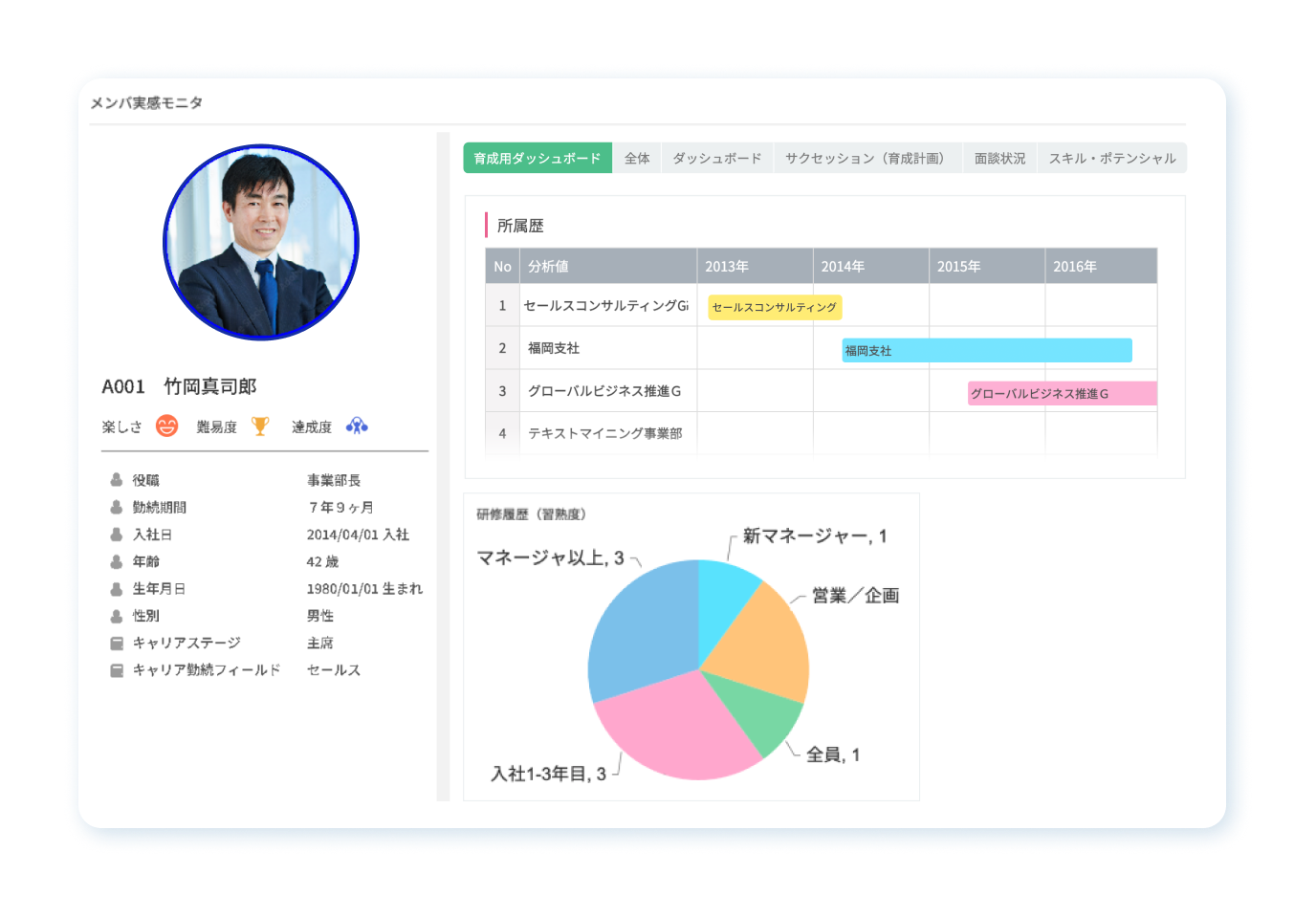 見たい情報だけを選んで、社員ごとの「カルテ」のように画面を自由に作れます。マネージャーや人事の方、そして社員自身が、それぞれに必要な情報を手軽に確認できます。
