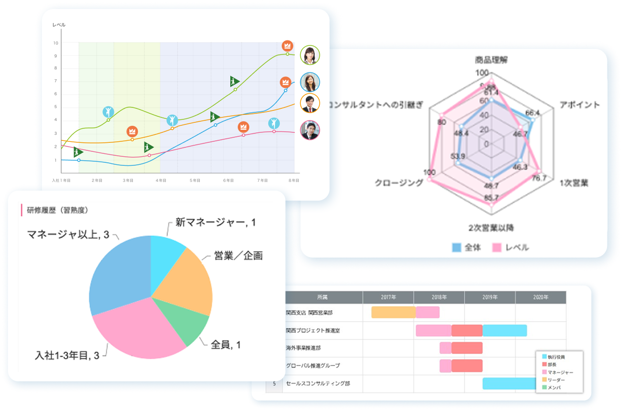 経営層の意思決定から現場のマネジメント層による日々の指導まで、組織のあらゆる階層で活用できる設計です。人材データを多角的に分析し、戦略的な人事施策の立案・実行を支援します。