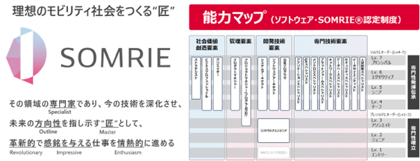 デンソーでは、ソフトウェア人材の能力を普遍的に定義し、認定するSOMRIE®認定制度を設け、人材の見える化および育成する仕組みの基盤として運用されています。社員一人ひとりが高度な能力を身につけ、組織を超えて必要とされる場で活躍するための最適配置の実現を目指すとともに、今後SOMRIE®認定制度を産業界に広め、産業界全体のソフトウェア人材不足を解決することが重要と考えられています。