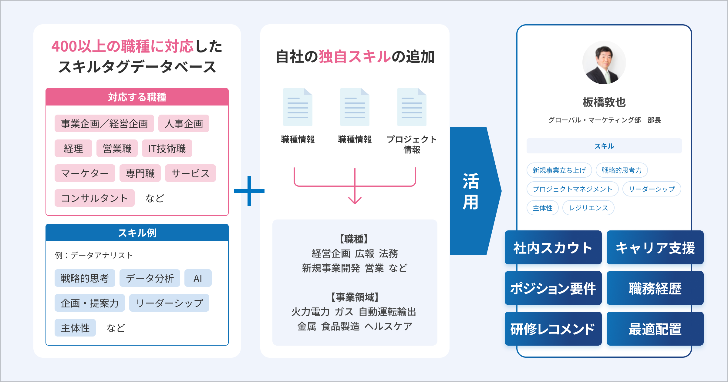 タレントパレットは、400以上の職種に対応した独自のスキルタグデータベースを搭載しており、登録された人材データから生成AIが社員の保有スキルを自動で判別し、タグ付けします。