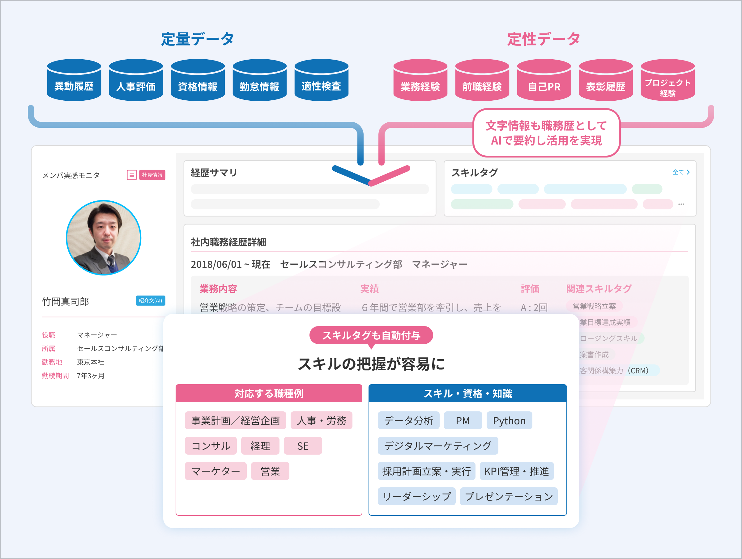 「職務経歴自動生成機能」は、社員の職務経歴をサマリとしてまとめるだけではなく、経験やスキル、適性検査などを活用した特徴や強みを作成します。
