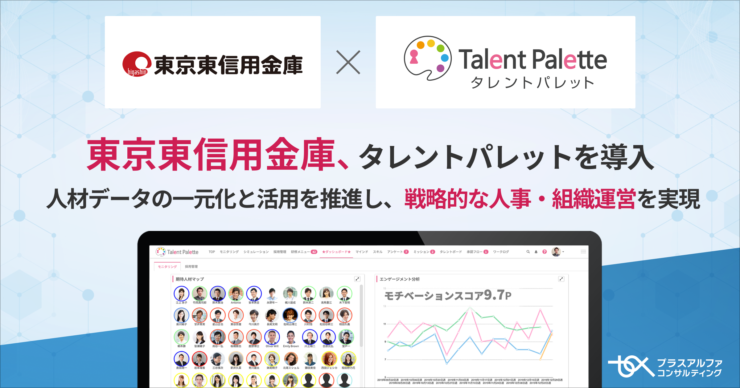 株式会社プラスアルファ・コンサルティングは、データに基づく人材活用や人的資本経営の実践、人事業務のDX化、リスキリングの推進などを目的に、多くの大手企業で導入が進むシェアNO.1(*)のタレントマネジメントシステム「Talent Palette(以下:タレントパレット)」を東京東信用金庫(本部:東京都墨田区、理事長:吉田 誠)に導入いただきましたことをお知らせします。