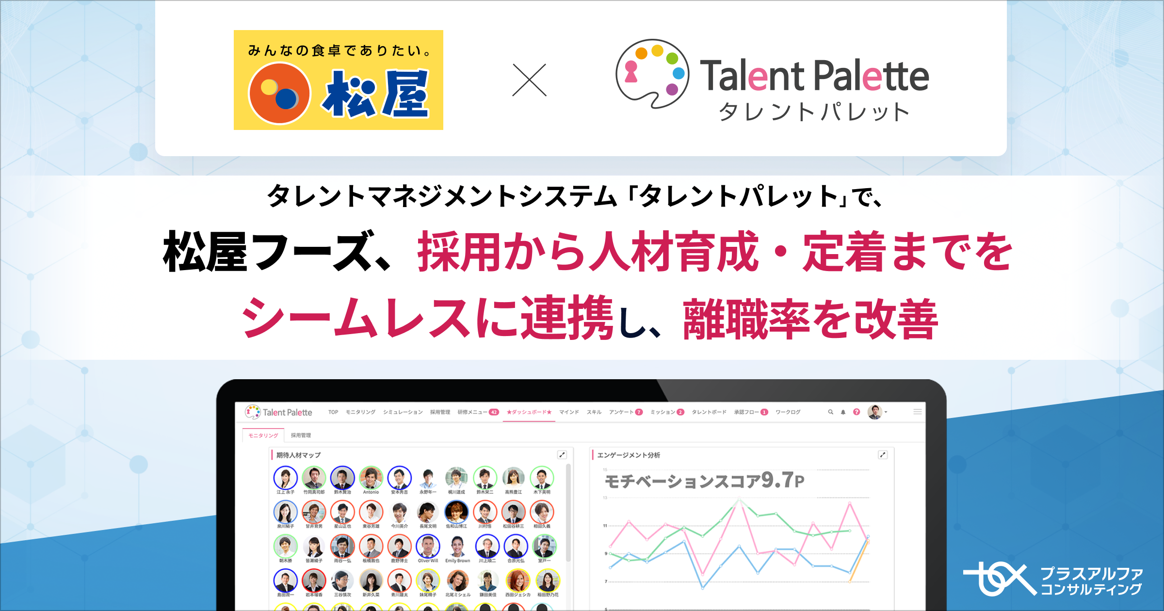 株式会社プラスアルファ・コンサルティングは、同社が提供するデータに基づく人材の活用、人的資本経営の実践、人事業務のDX化、リスキリングの推進などを目的に、多くの大手エンタープライズ・中堅企業で導入が進むシェアNO.1(*)のタレントマネジメントシステム 「Talent Palette(以下:タレントパレット)」 の株式会社松屋フーズホールディングス(本社:東京都武蔵野市、代表取締役社長:瓦葺 一利、以下:松屋フーズ)への導入事例を公開しました。