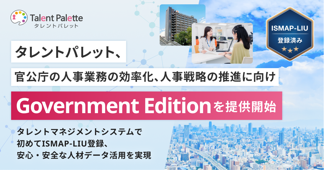 シェアNo.1のタレントマネジメントシステム「タレントパレット」、地方自治体・省庁をはじめとした官公庁の人事業務の効率化、人事戦略の推進に向け 「Talent Palette Government Edition」を提供開始〜タレントマネジメントシステムで初めてISMAP-LIU登録、安心・安全な人材データ活用を実現~