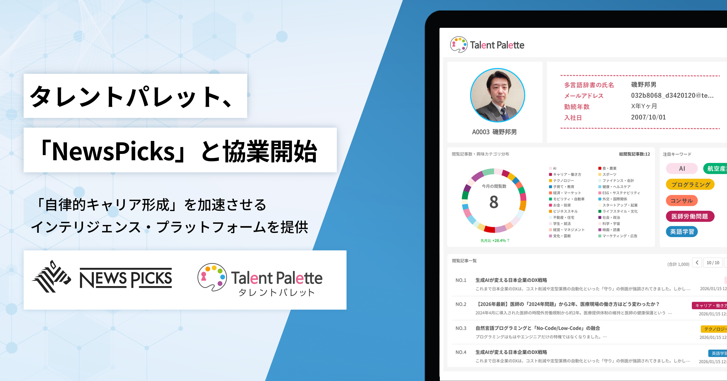 タレントパレット、NewsPicksと戦略的協業を開始~「自律的キャリア形成」を加速させるインテリジェンス・プラットフォームを提供~