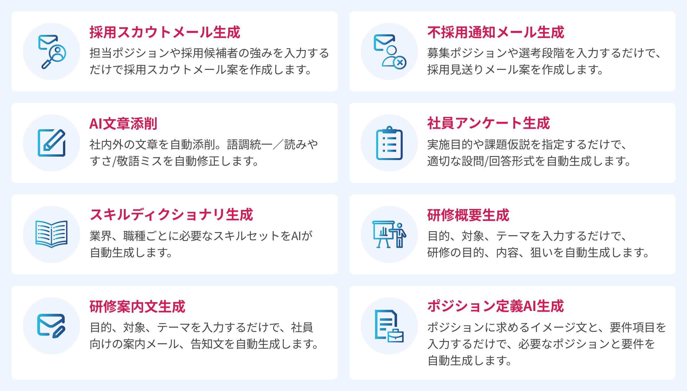 従来、設問設計やスキル定義には多くの工数・時間・コストがかかり、施策実行の妨げとなるケースがありましたが、本プロンプト集により、その障壁を解消し、スピーディーな施策実行を可能にします。